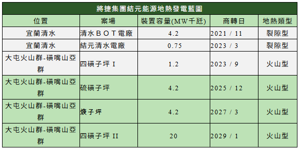 深耕台灣、從建築起家的將捷集團,看到98%仰賴進口的能源困境,2018年毅然決定入股投資結元能源、投入地熱發電建置;2021年11月投入7.65億元並結合政府資源,成功讓擱置30年的宜蘭清水BOT地熱電廠起死回生,成為全台第一個拿到地熱電業執照的民間業者,打造首座成功併聯上線的地熱電廠,4.2MW裝置容量如滿載發電,可供應約1.2萬戶家庭非夏月用電。