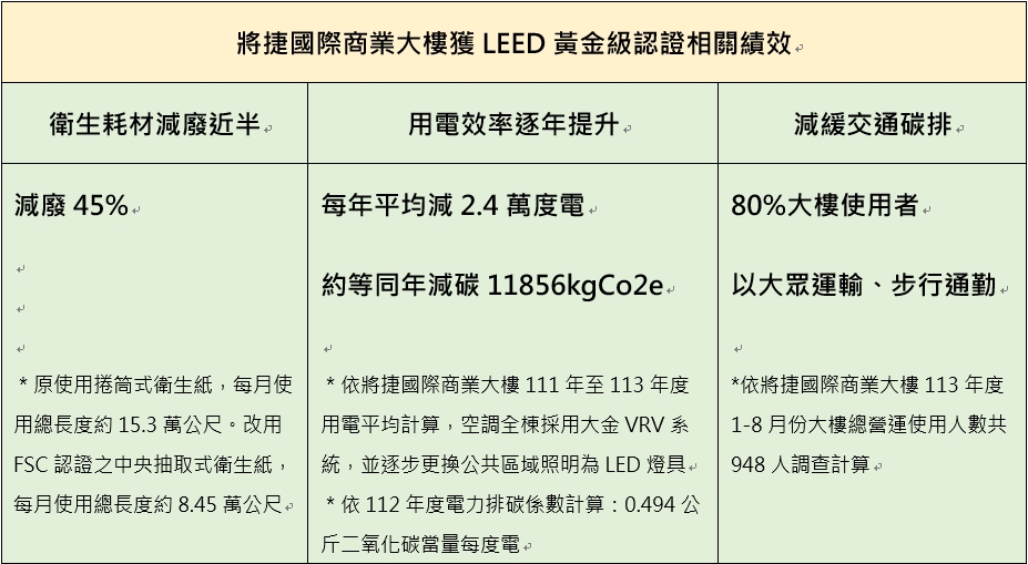 以建築地產起家、跨足文創休閒及地熱能源事業的將捷集團,位於台北市中山區的企業總部「將捷國際商業大樓」,12月27日獲美國綠色建築協會USGBC頒發LEED v4.1黃金級認證,成為台北捷運聯合開發案中首座獲得LEED黃金級認證的既有建築。授證儀式由USGBC北亞區董事總經理杜日生、台北捷運工程局課長張世卓、兆豐銀行北區營運中心黃淑娥營運長、輔導顧問團隊–台北101協理林哲雄與大樓承租企業代表–和泰產險副總經理林聖智等重要貴賓,及將捷集團創辦人林長勲、董事長林嵩烈、執行長林莉婷共同見證,展現建築產業助力台灣2050淨零排放的具體作為。